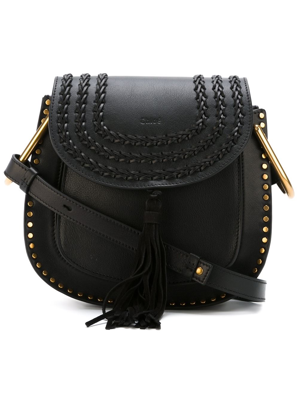 - Chloé 黑色 绒面皮与小牛皮 'Hudson'小号斜挎包。 翻盖饰有插入式的摁扣, 流苏挂饰, 正中有品牌标记, 饰缝合细节, 金色五金配件, 金色铆钉, 可调肩带, 正面开口式口袋, 内置多个分层, 内置标签。
