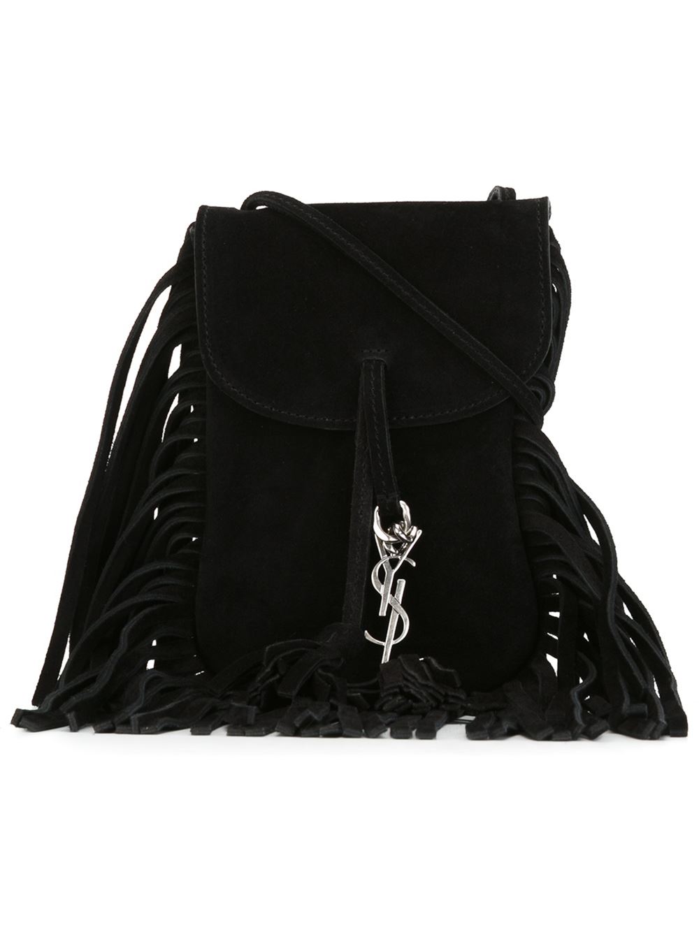 - Saint Laurent 黑色 绒面皮 'Anita'toy单肩包。 翻盖饰有插入式的摁扣, 银色标牌, 肩带, 流苏细节。