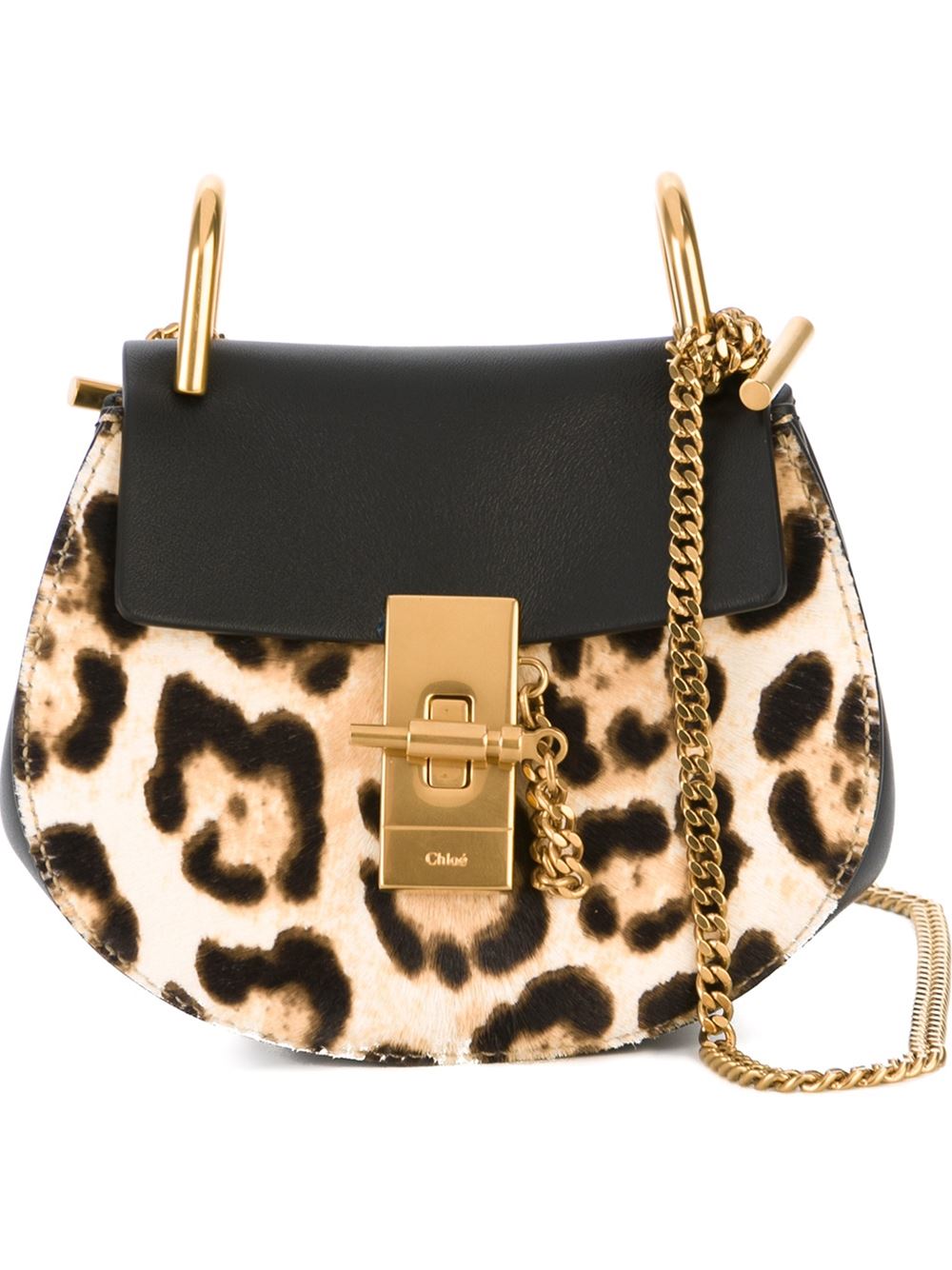- Chloé 黑色褐色米色 小牛皮 'Drew'豹纹单肩包。 翻盖饰有插入式的摁扣, 金色五金配件, 金色铁链肩带, 内置浮雕标记。
