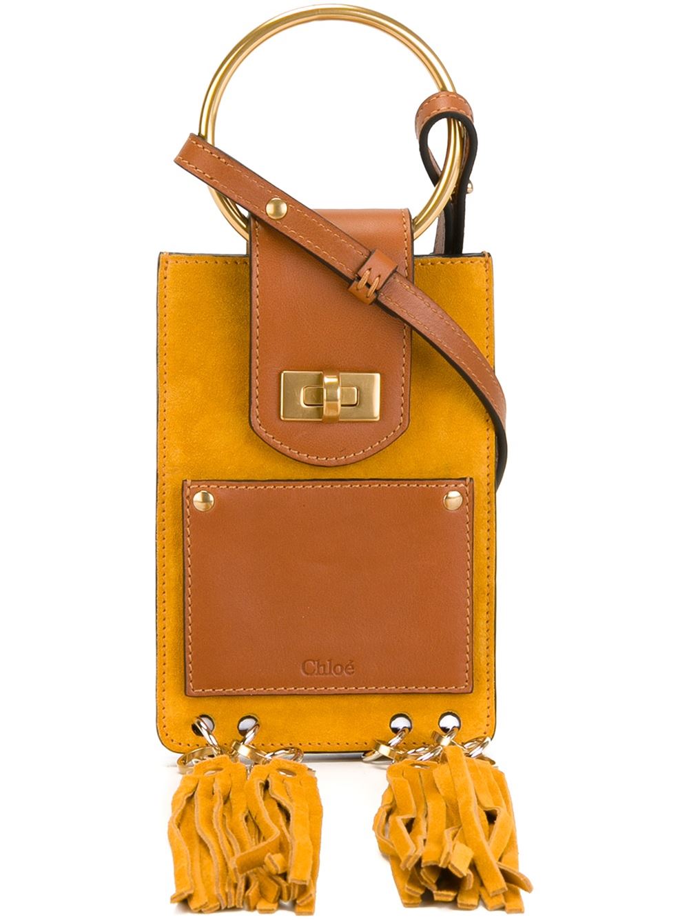- Chloé 驼色与黄色 小牛皮与小牛绒面皮 'Jane'迷你斜挎包。 翻盖饰有旋扣, 流苏细节, 正面有贴袋, 金色五金配件, 可拆卸可调肩带, 内置贴袋, 内置标贴, 绒面皮衬里。