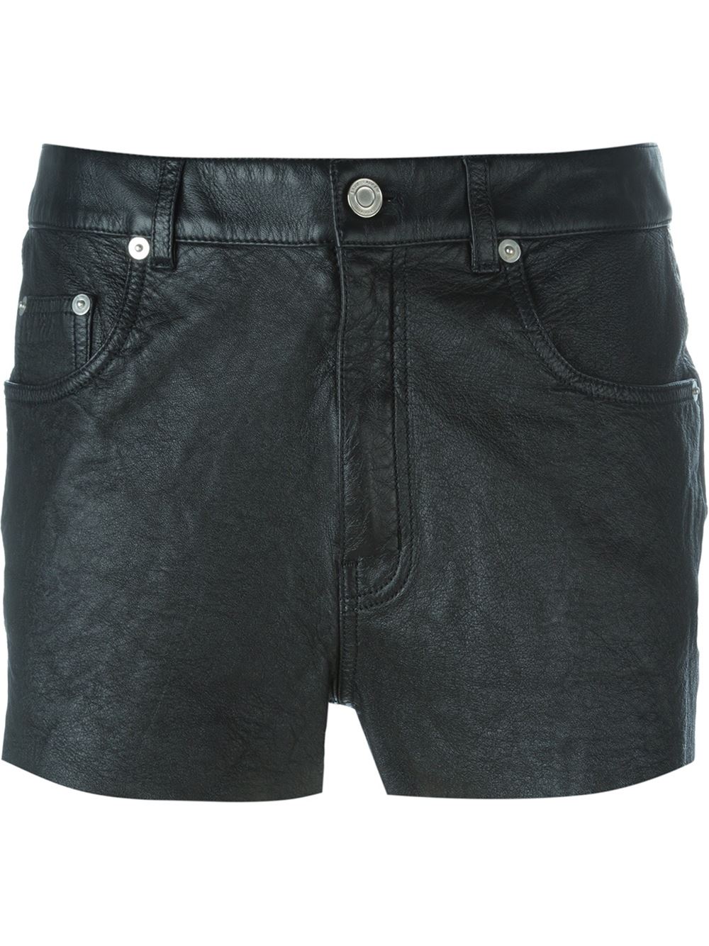 - Saint Laurent 黑色 牛皮 丹宁风短裤。 纽扣与拉链开合, 腰带袢, 五口袋设计, 铆钉细节, 磨损边。