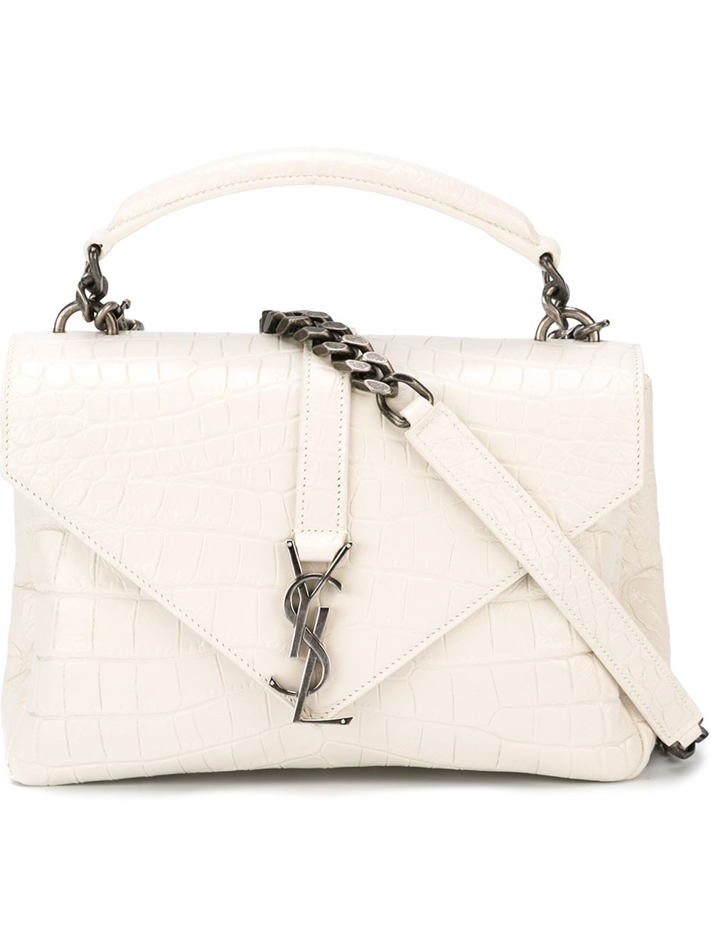 - Saint Laurent 白色 牛皮 'Monogram'中号斜挎包。 信封式, 正面标志贴, 顶部饰有扁平手柄, 银色五金配件, 皮革边饰链式肩带, 带浮雕及鳄鱼皮效果, 全衬里, 内置拉链口袋, 内置贴袋。