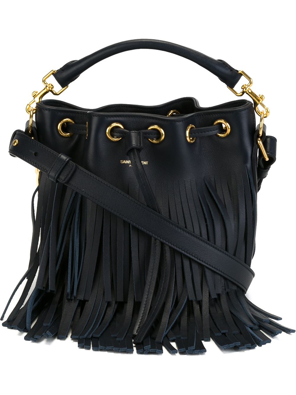 - Saint Laurent 深海军蓝色 小牛皮 'Emmanuelle'小号水桶包。 流苏设计, 抽绳系带, 可拆卸顶部手柄, 可调肩带, 金色五金配件, 内置标贴。