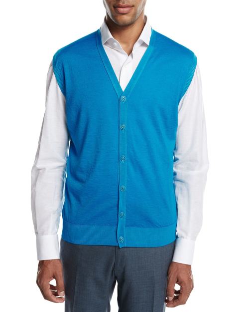 Kiton Cashmere-Silk V-Neck Cardigan Vest, Aqua (Blue)