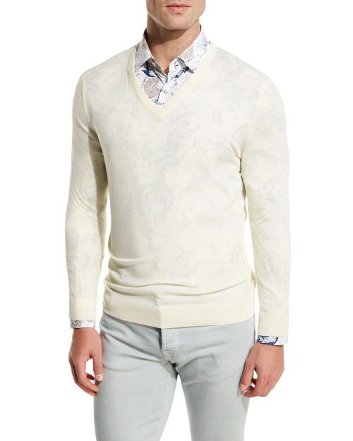 Kiton Fine-Gauge V-Neck Sweater, Ivory/Cream