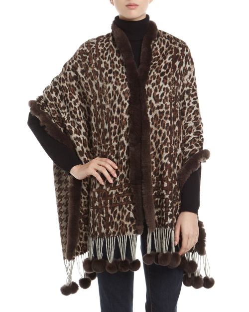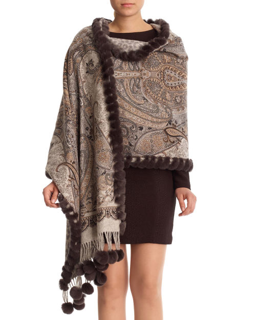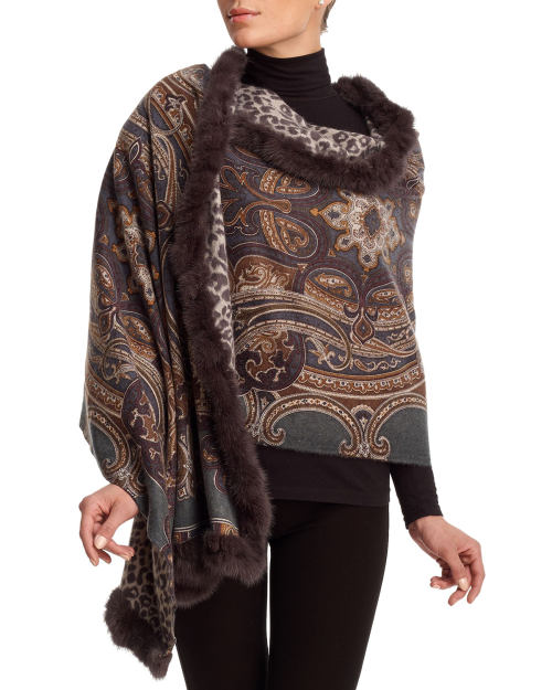 Gorski Reversible Cashmere Rabbit-Trim Wrap, Brown