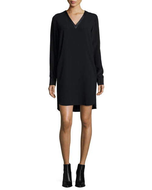 Vince Long-Sleeve Mixed Media V-Neck Dress